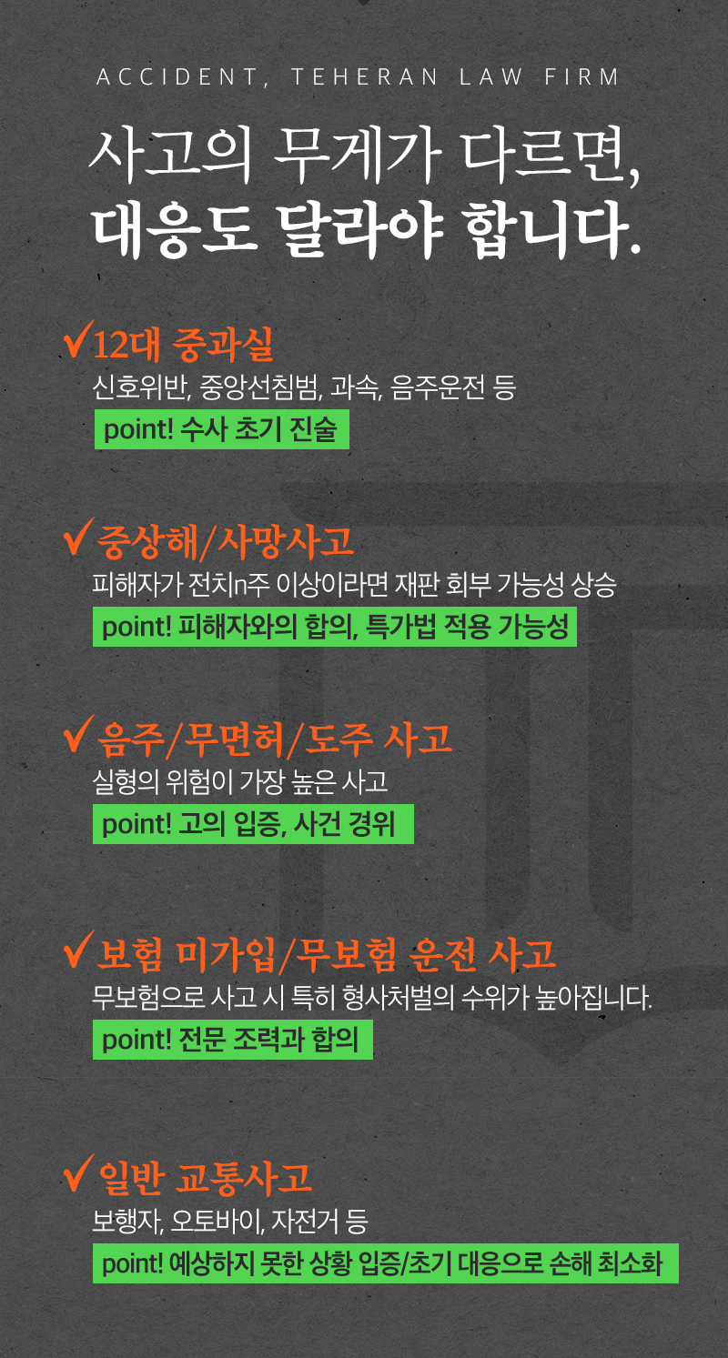 법무법인 테헤란 교통팀은 운전자에게 사고 대응 매뉴얼과 보험 처리 체크리스트를 제공하여, 향후 불필요한 분쟁과 비용 부담을 예방하도록 안내합니다.